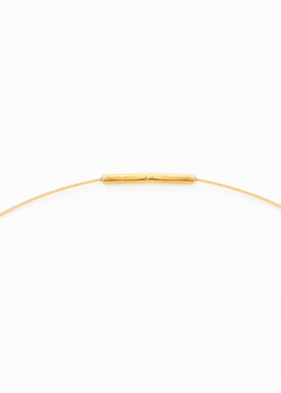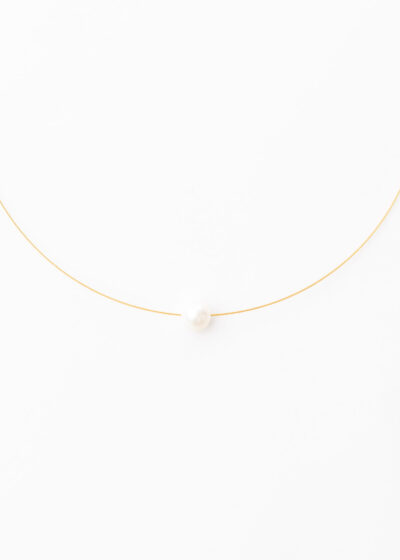 Die Zuchtperle schwebt auf einem Edelstahlseil am Hals. Der Reif ist vergoldet und wird mit einem Bjonettschloß geöffnet.