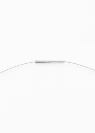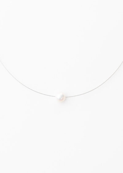Die Zuchtperle schwebt auf einem Edelstahlseil am Hals. Der Reif wird mit einem Bjonettschloß geöffnet.