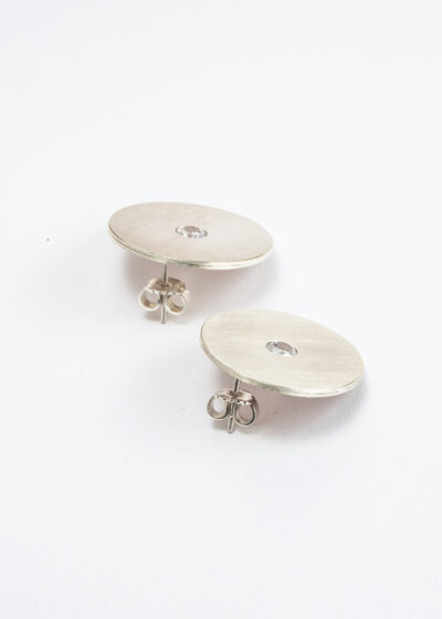 Große Ohrringe aus Silber, in der Mitte ist ein farbloser Zirkonia gefasst. Auf Wunsch kann auch ein andersfarbiger Stein verarbeitet werden. Der Durchmesser der Ohrringe ist 25mm.