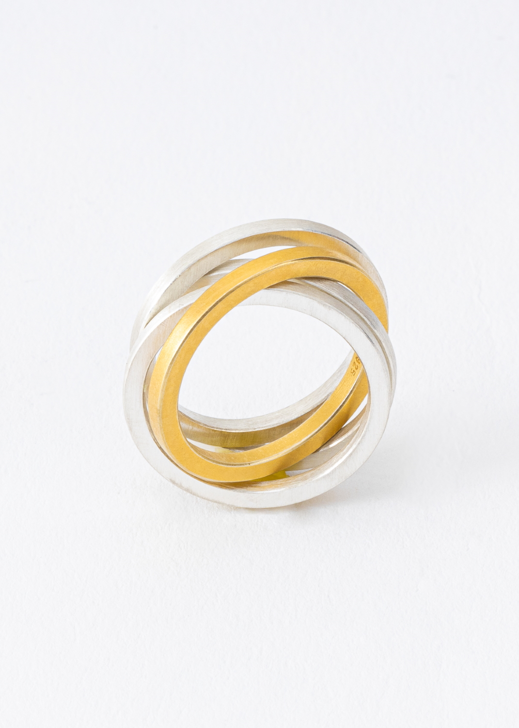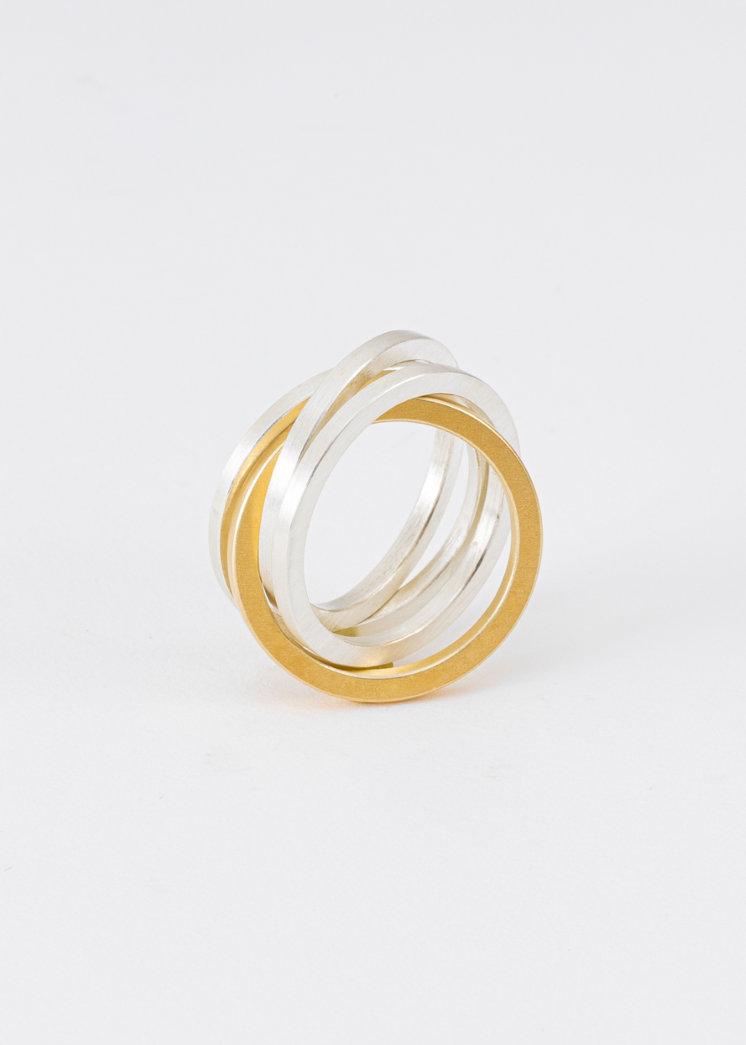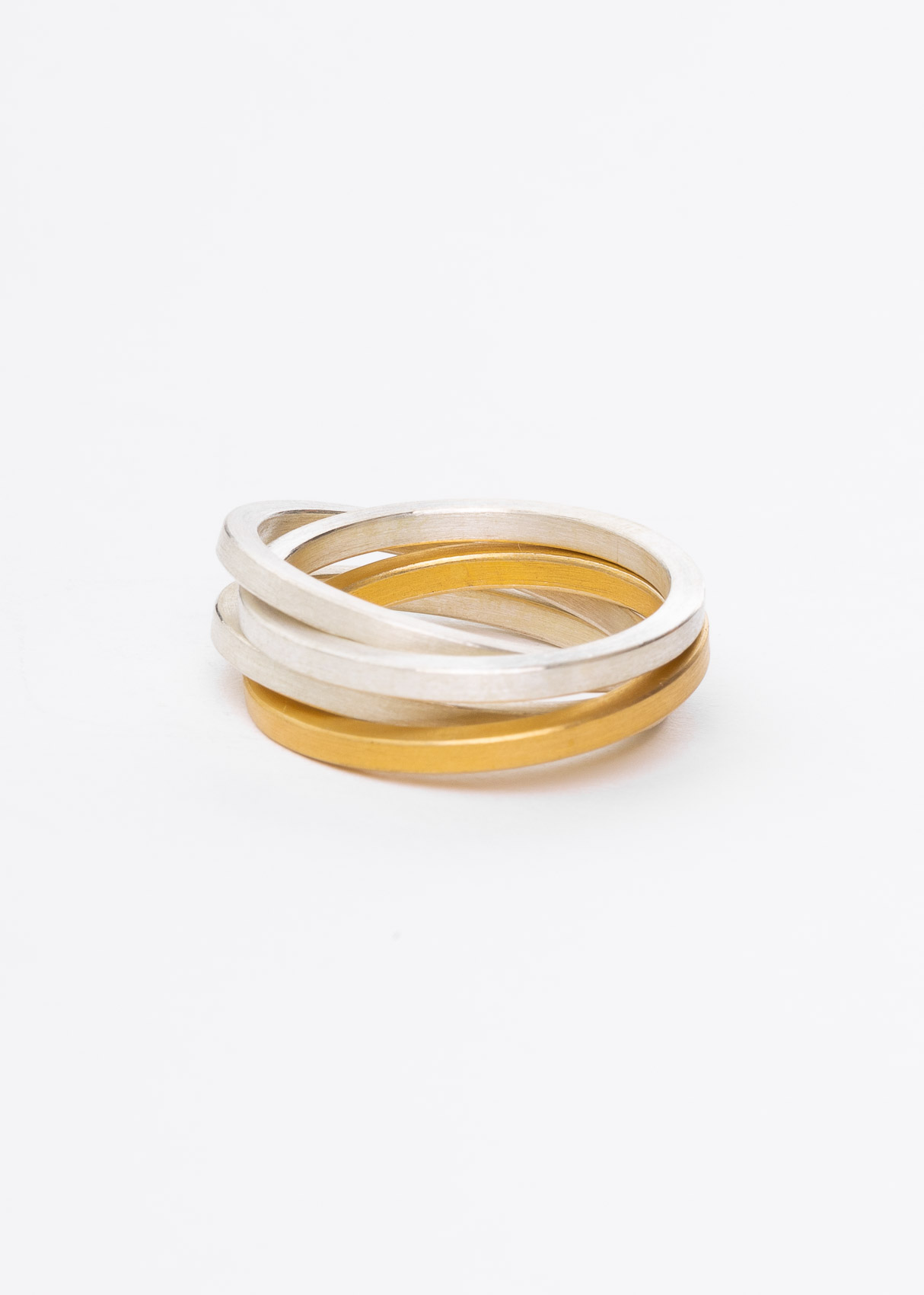 Drei Ringe sind aus Silber, einer aus vergoldetem Silber. Alle vier Ringe hängen lose ineinander.