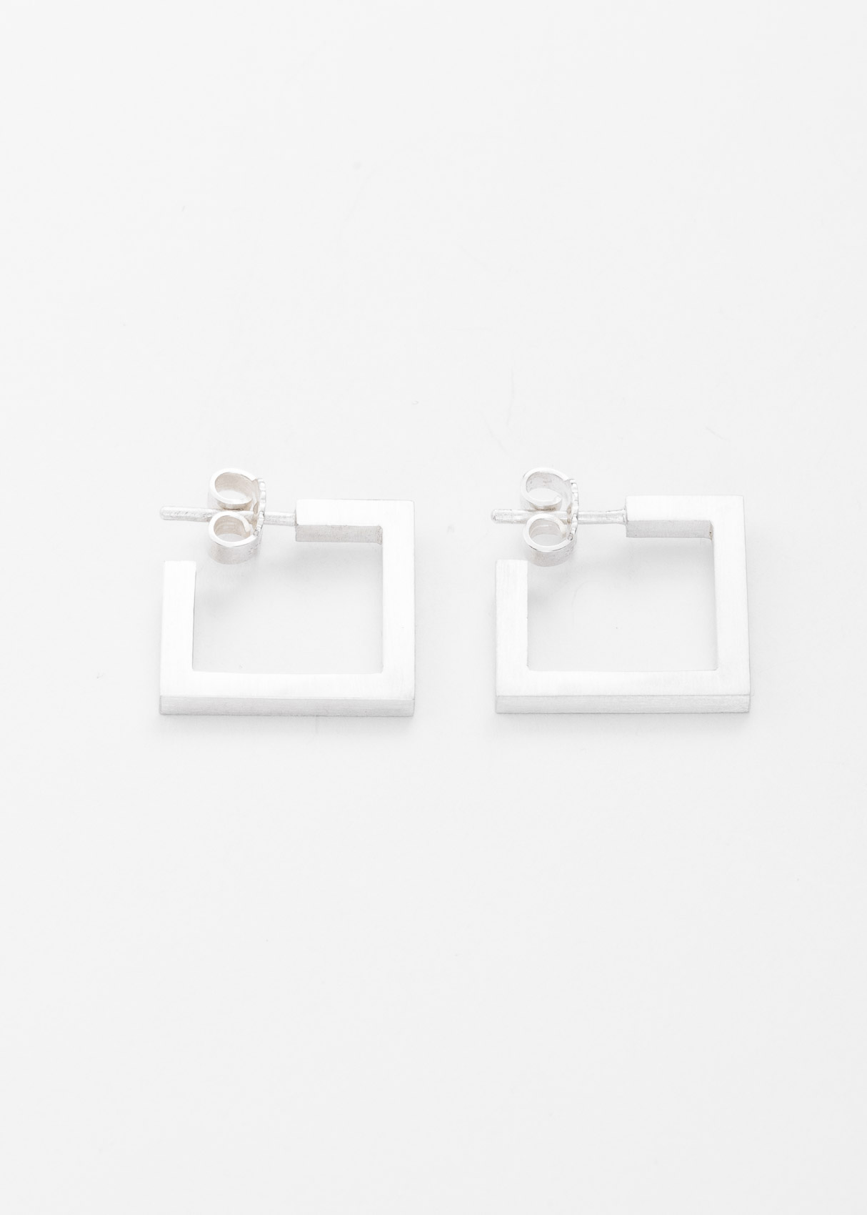 Die Ohrringe bestechen durch die Einfachheit ihrer Grundform des Quadrats. Sie sind aus Silber und haben eine Kantenlänge von 18mm