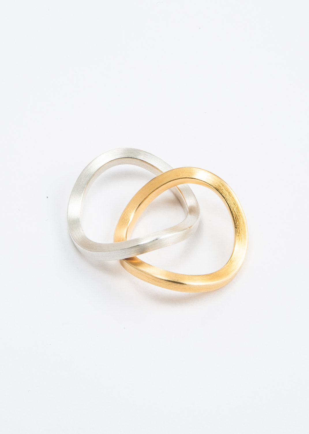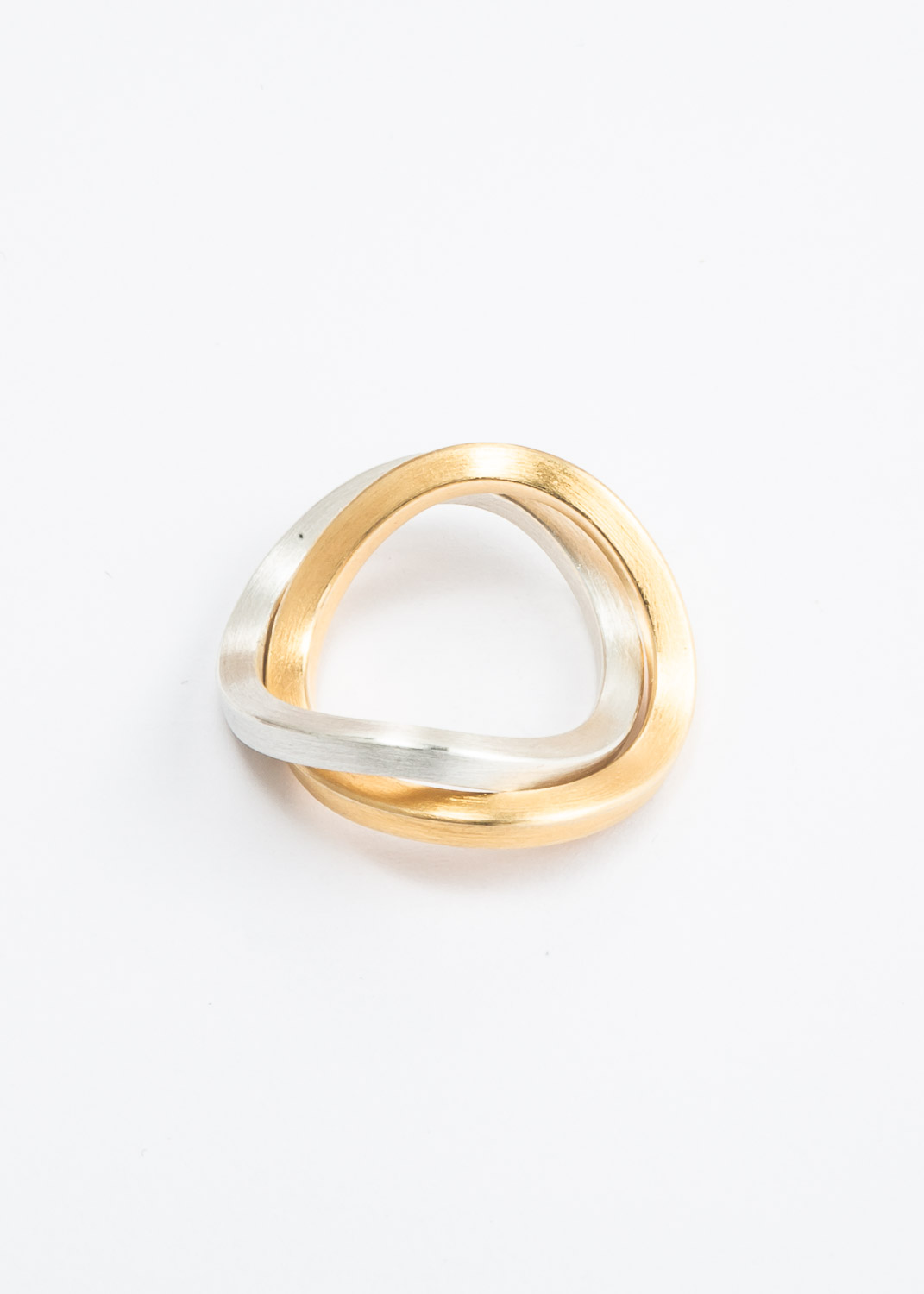 Beide ineinanderhängenden Ringe sind leicht gewellt und aus Silber, der eine dick vergoldet.