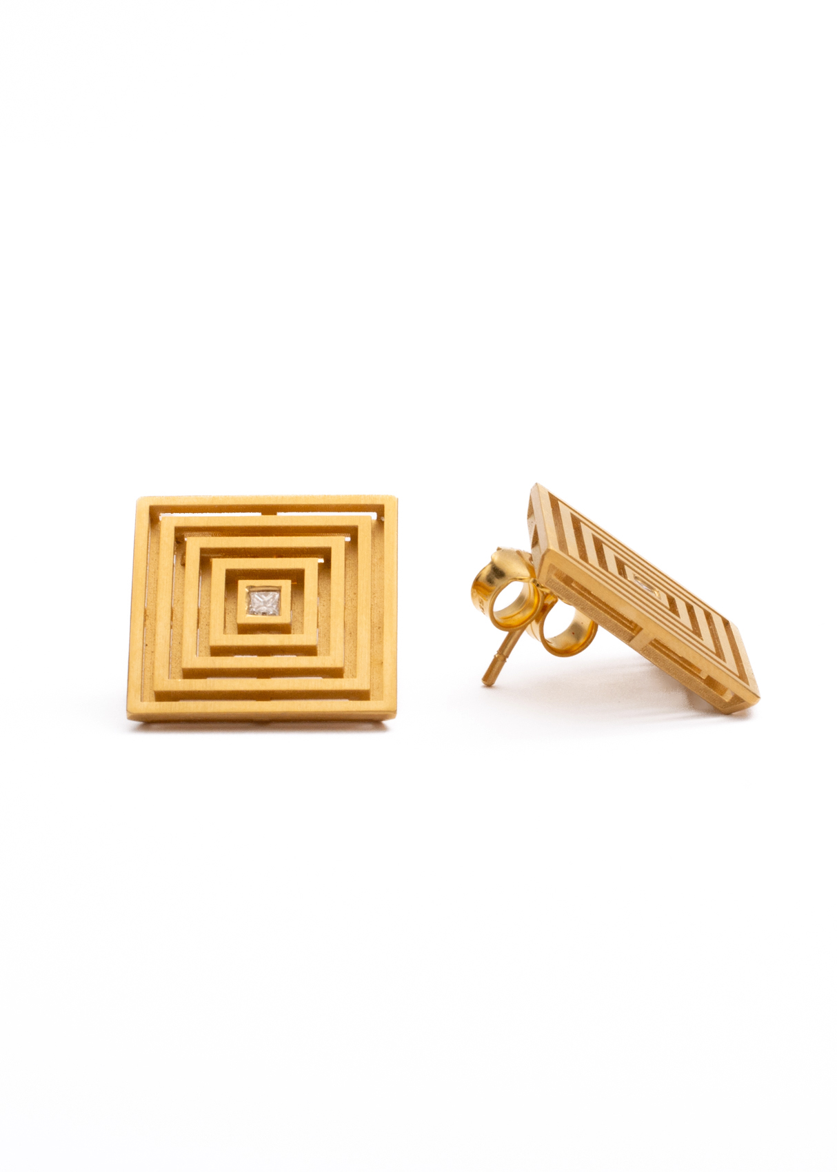 Die Ohrringe sind aus Silber, dick vergoldet, mit einem Brillianten in der Mitte.