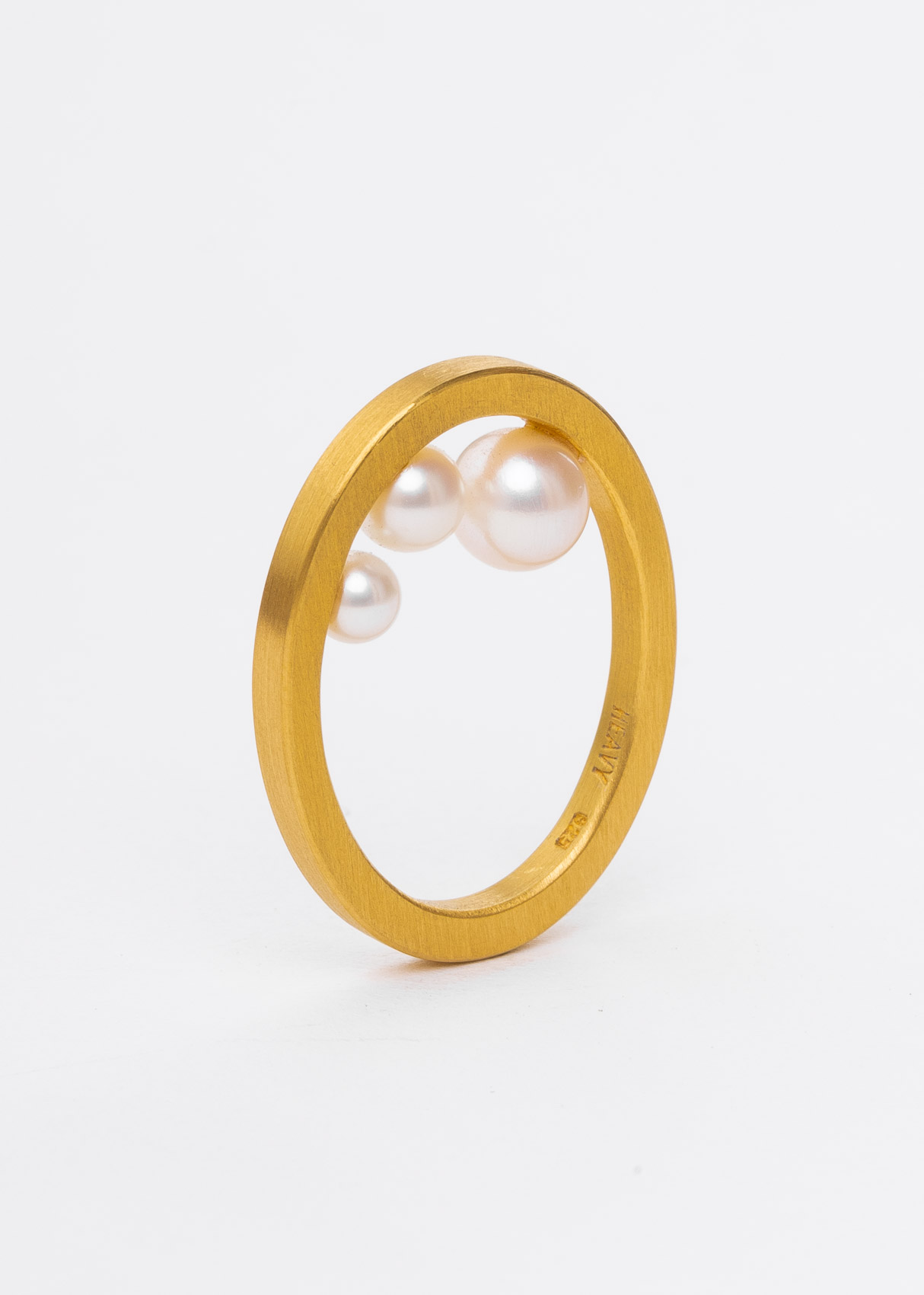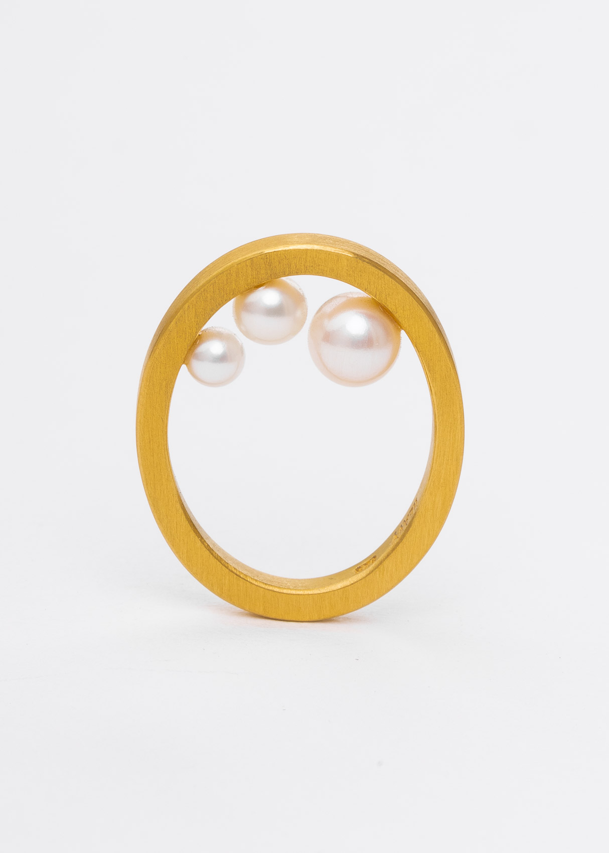 Der O-förmige Ring ist aus Silber, vergoldet. Die 3 Perlen liegen innen, also auf dem Finger.