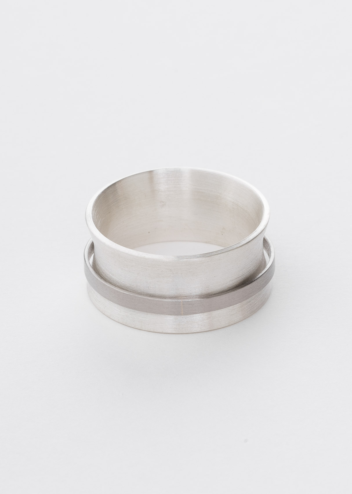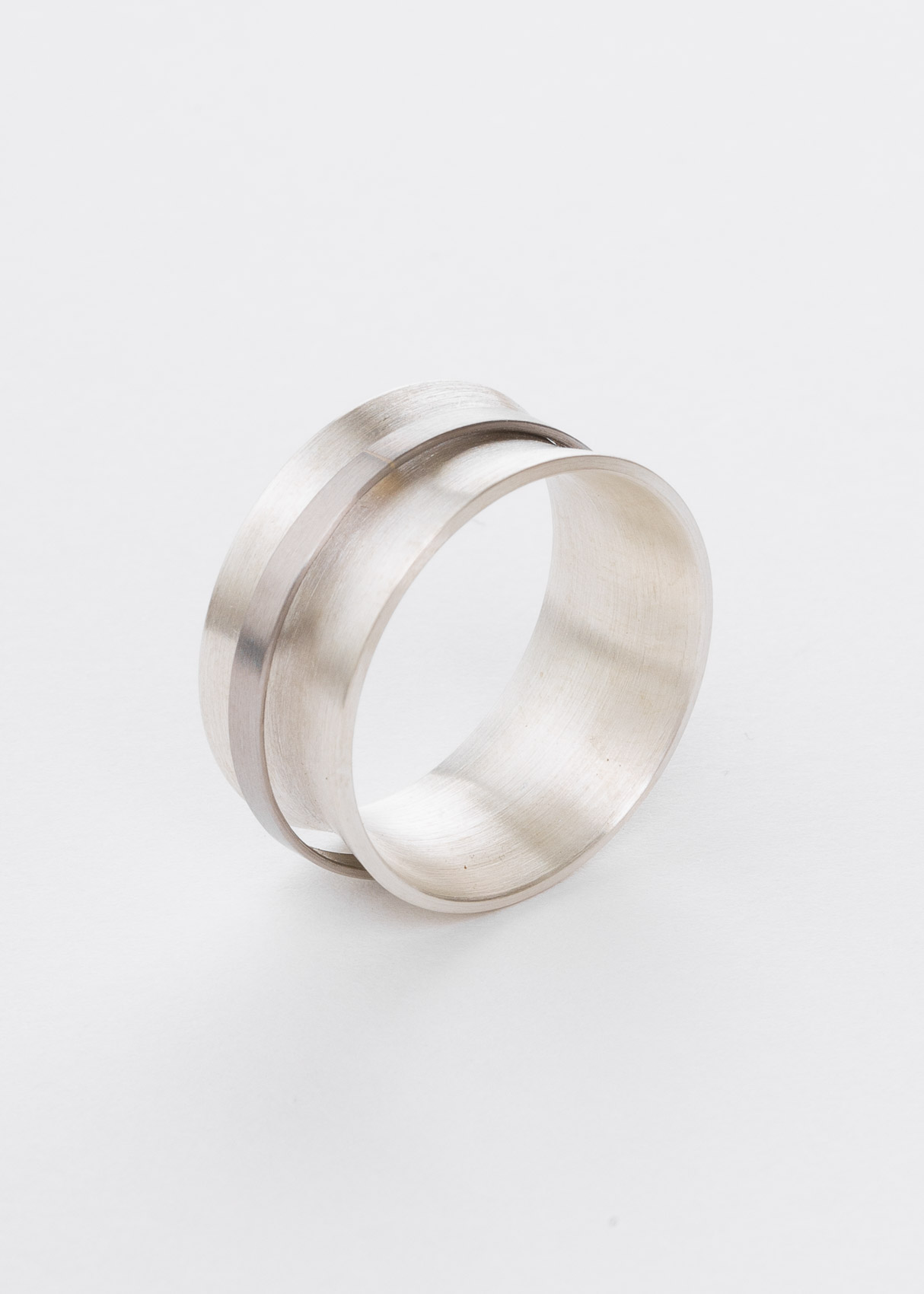 Konkav gewölbter Ring aus Silber mit beweglichem Ringel aus Edelstahl.
