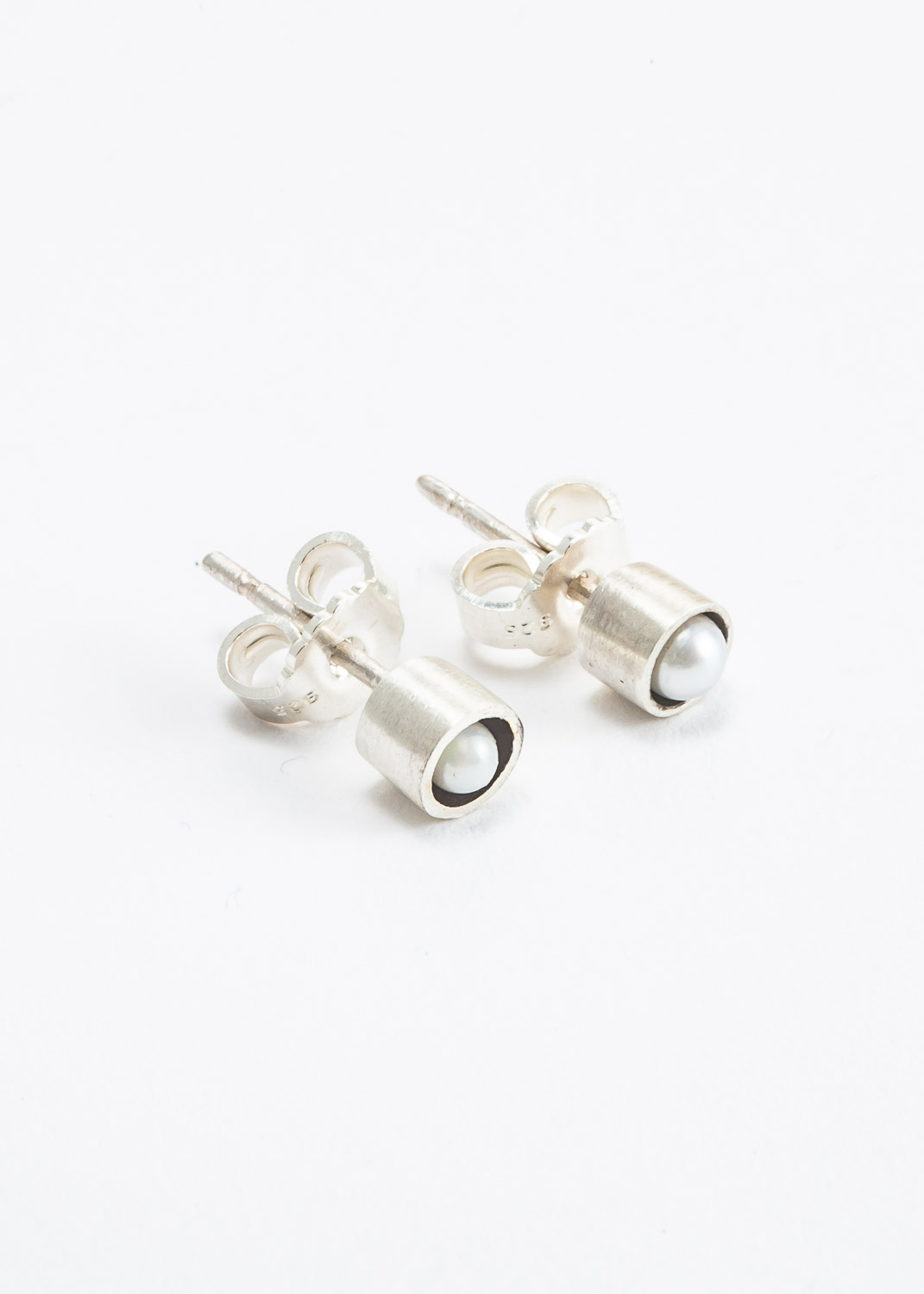 Kleine Ohrstecker aus Silber, in der Mitte ist eine Süßwasserzuchtperle eingearbeitet.