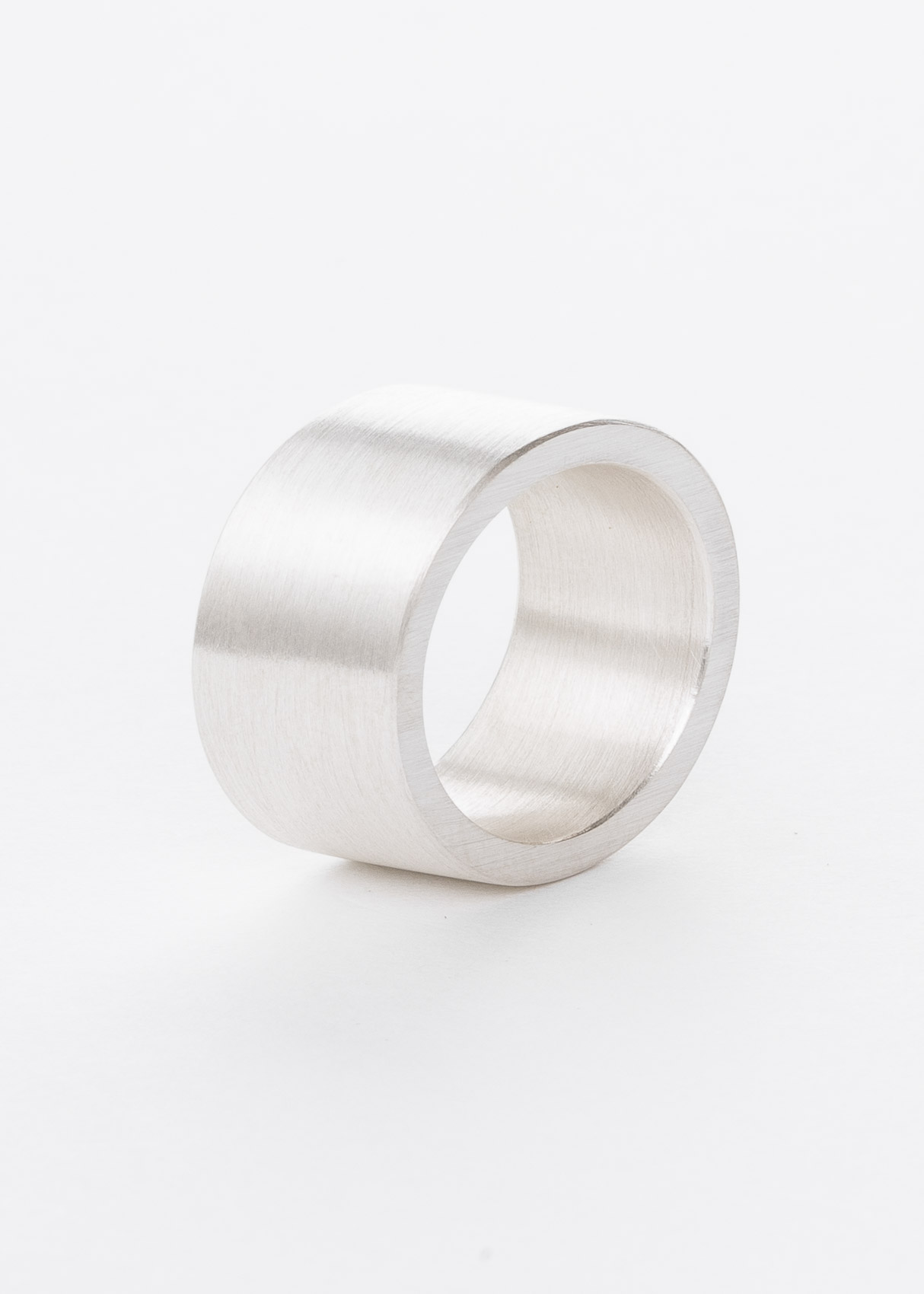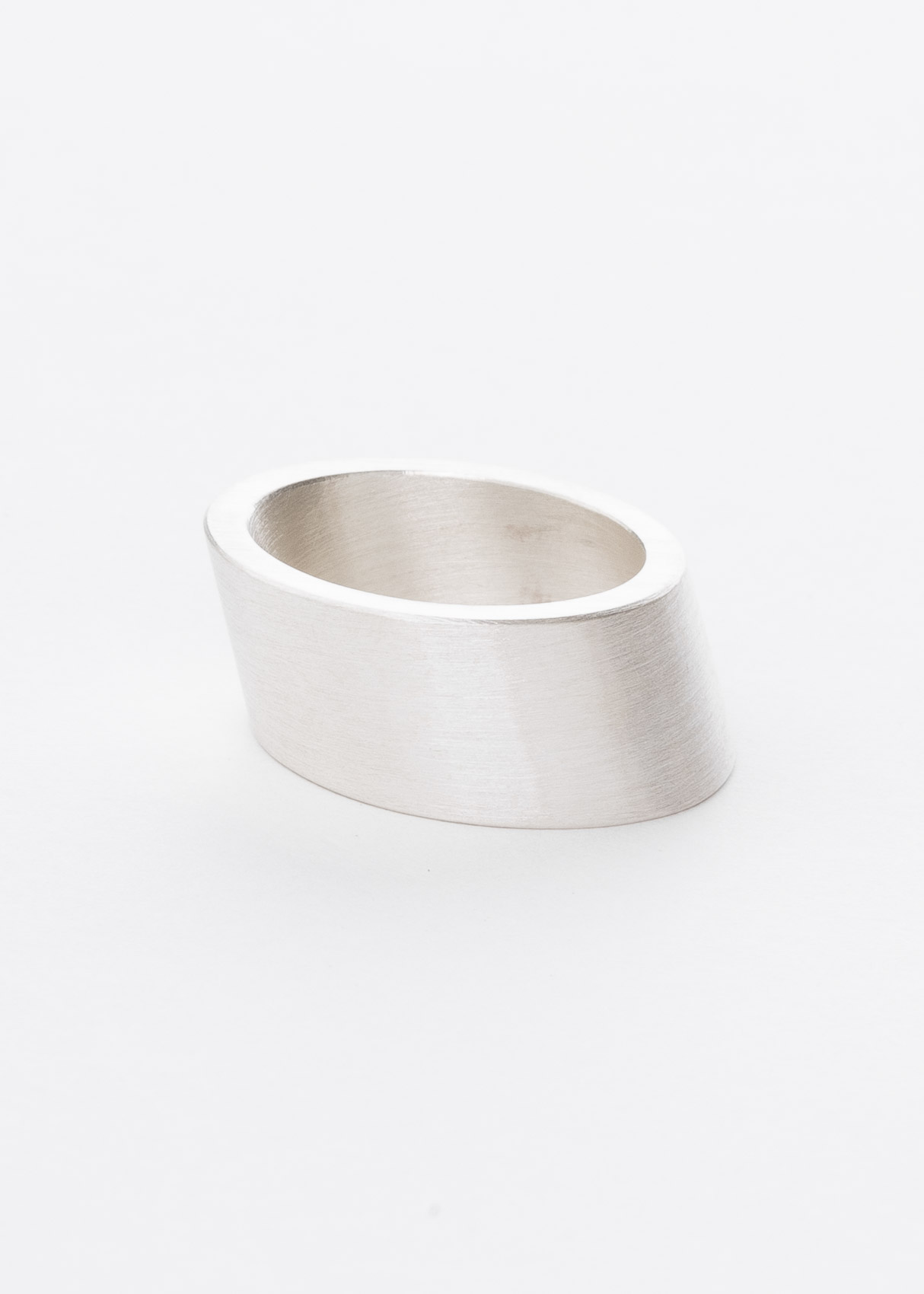 Der schräge, 10mm breite Ring ist aus Silber. Die Schräge sitzt perfekt zwischen Ringfinger und Mittelfinger.