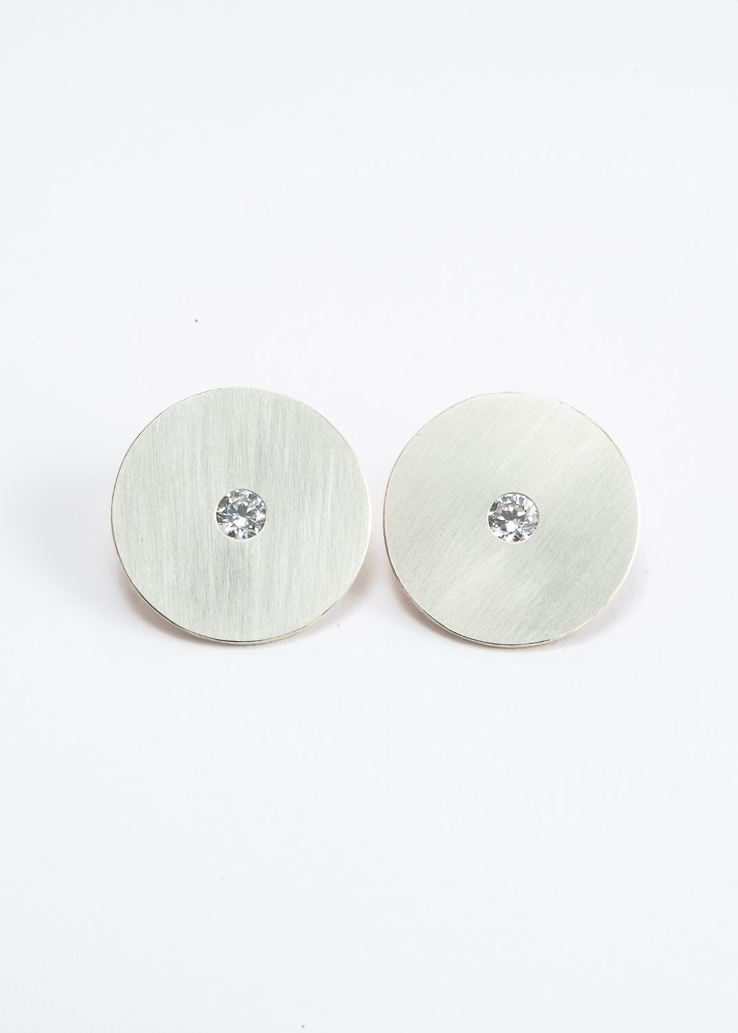 Große Ohrringe aus Silber, in der Mitte ist ein farbloser Zirkonia gefasst. Auf Wunsch kann auch ein andersfarbiger Stein verarbeitet werden. Der Durchmesser der Ohrringe ist 25mm.
