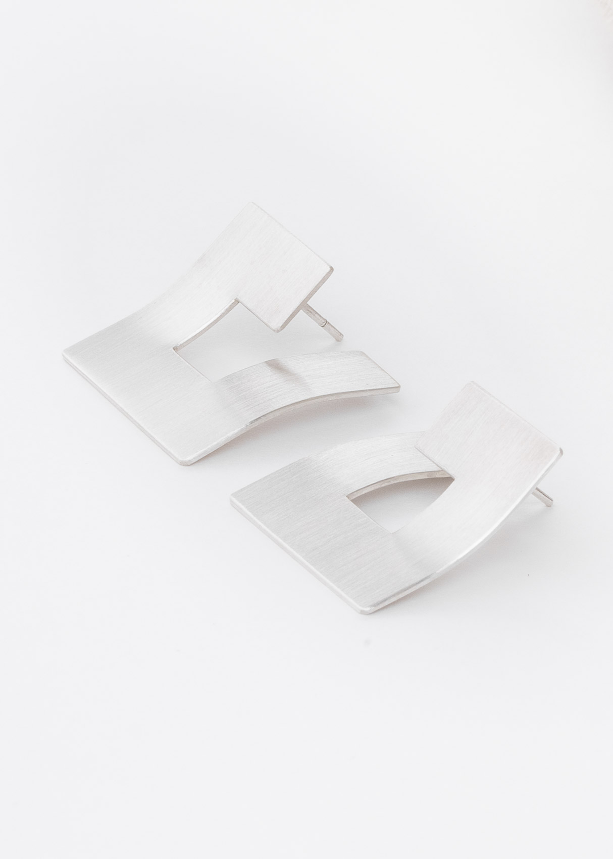 Diese Ohrringe legen sich flächig ans Ohr an. Sie sind nach dem gleichen Prinzip geformt, wie auch unsere geschwungenen Navettes. Das Material ist Silber. Die Kantenlänge ist 25mm.