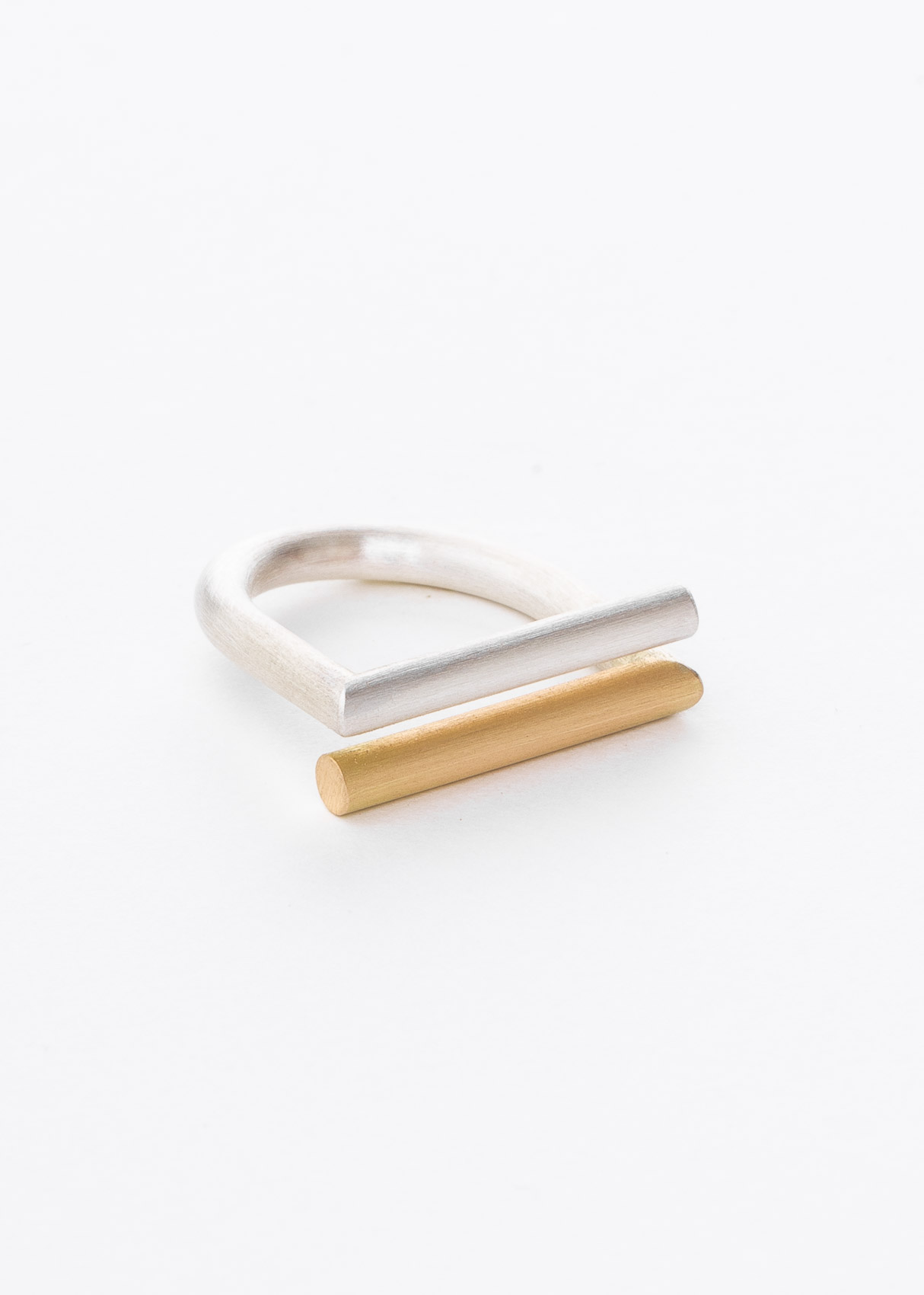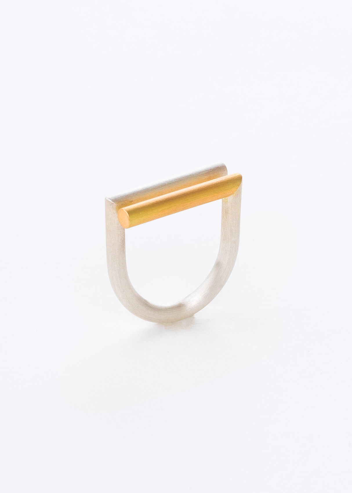 U-förmiger Ring aus Silber mit 2 Stäbchen, die parallel auf der Hand liegen. Ein Stäbchen ist aus Silber und das andere aus 750er Gelbgold.