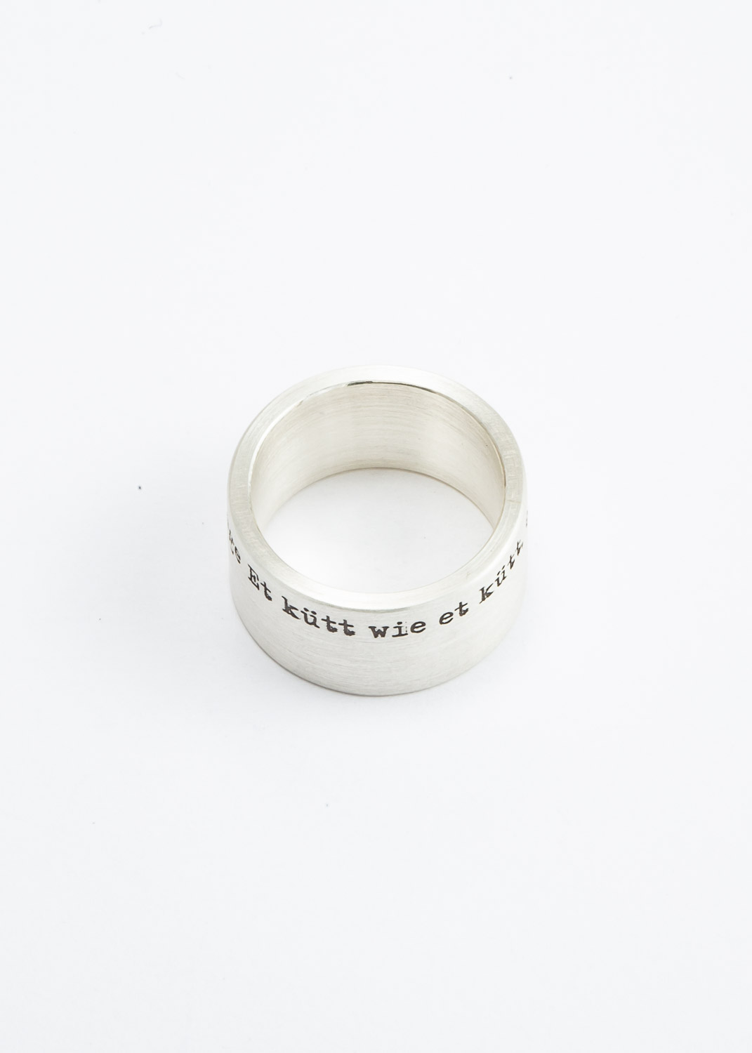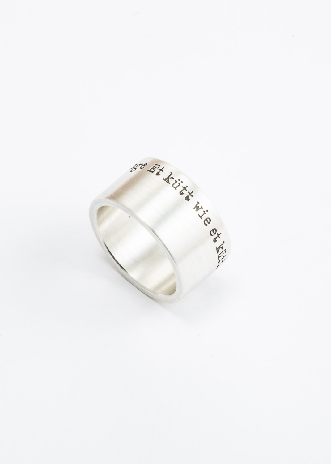 Gerader Bandring aus Silber mit eingraviertem “Et kütt wie et kütt”, es gibt verschiedene Varianten, individuelle Gravuren sind auch möglich.