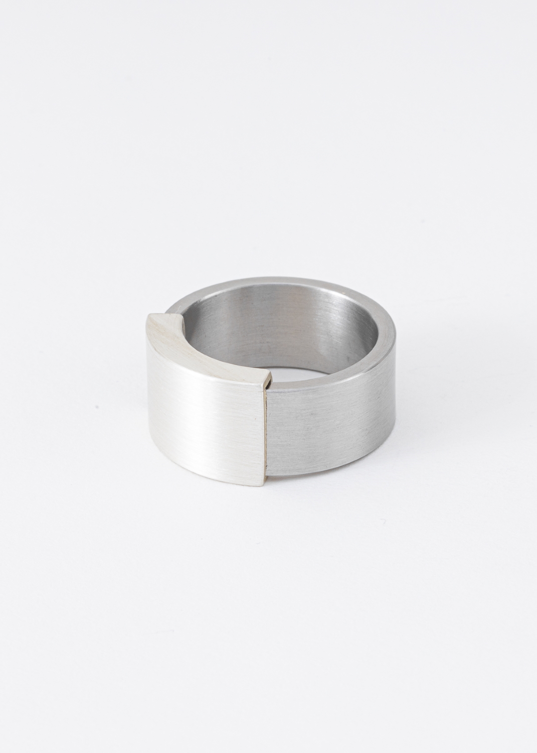 Der Bandring ist aus Edelstahl, das Silberelement lässt sich verschieben.