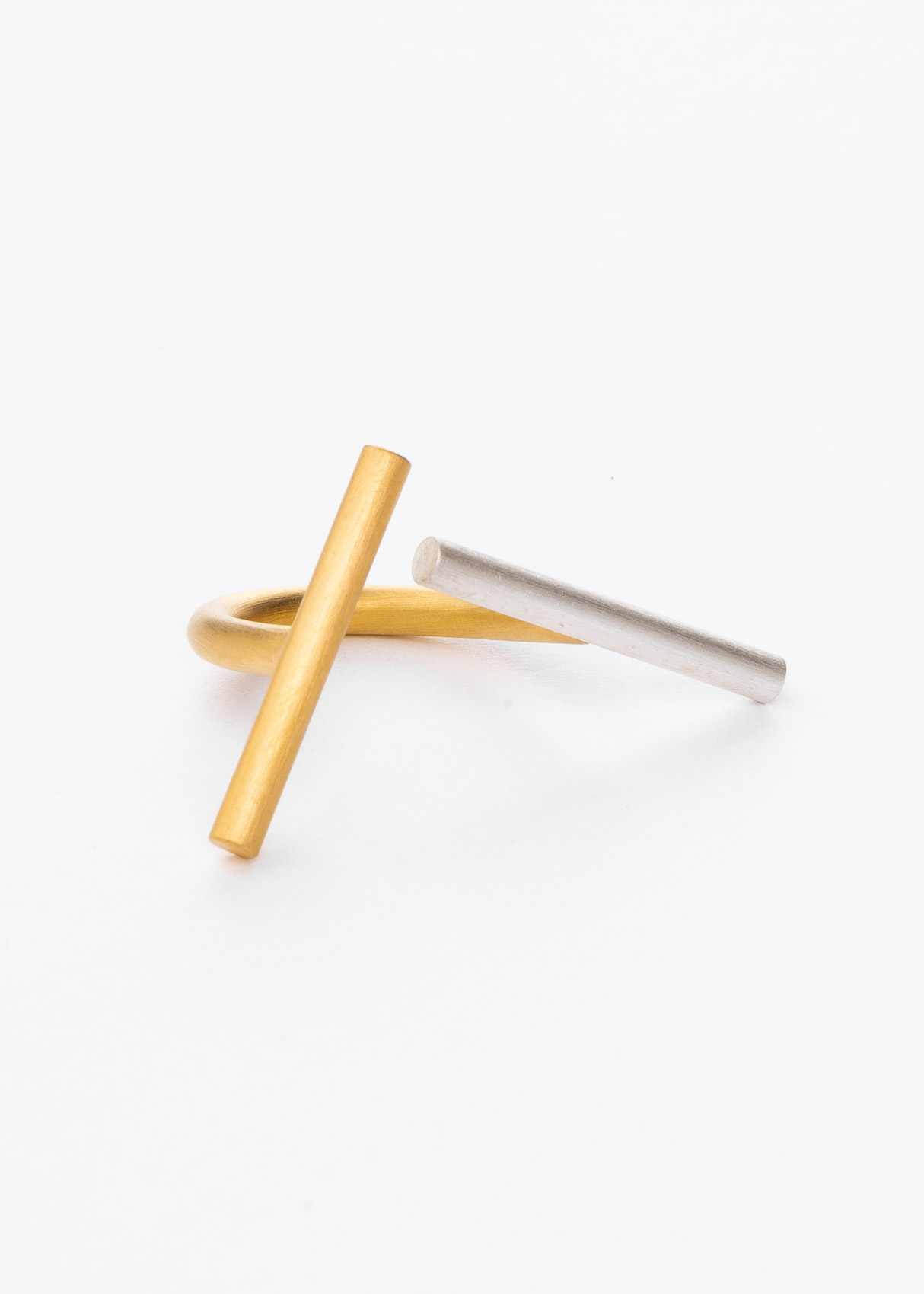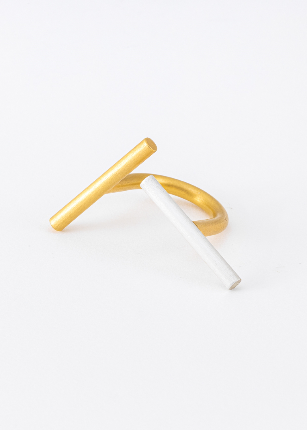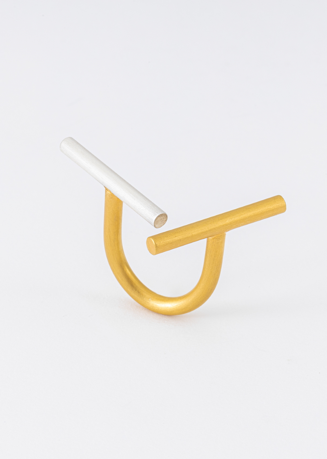 Der Ring ist aus Silber, die U-Ringschiene und ein Stäbchen sind vergoldet.